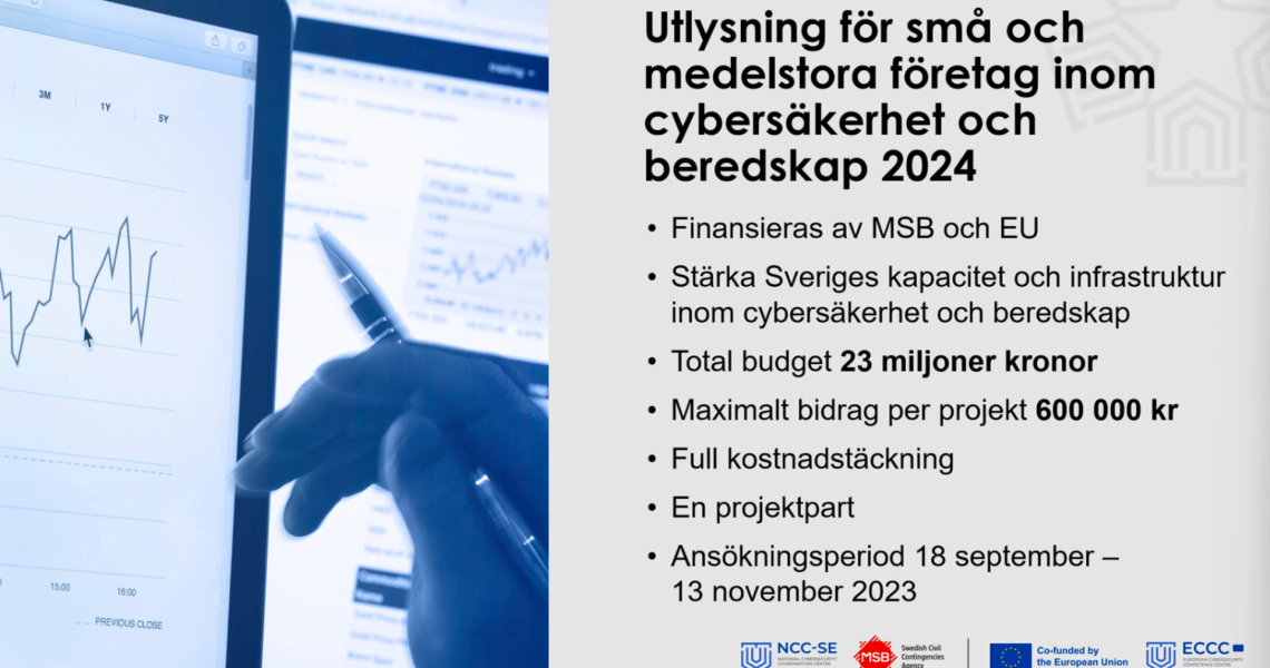 Utlysningen riktar sig till små och medelstora företag som söker utvecklingsbidrag för projekt inom cybersäkerhet. Finansieringen, på totalt 23 miljoner kronor från MSB och EU:s DIGITAL-program, ger upp till 600 000 kronor per projekt utan krav på medfinansiering. Både leverantörer och behovsägare kan ansöka. NCC-SE planerar att finansiera upp till 36 projekt, med projektstart tidigast i december 2024 och avslut senast den 31 mars.